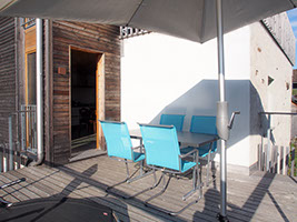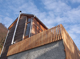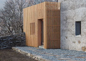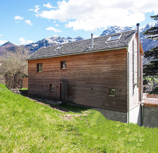 Nuova costruzione prefabbricata in legno. Rivestimento edifico ed esterni in legno di larice, che con il tempo diventa grigio argentato e si armonizza con la pietra dei muri. Il rustico in pietra esistente è stato mantenuto ed integrato nella costruzione.