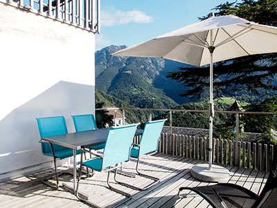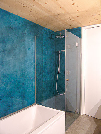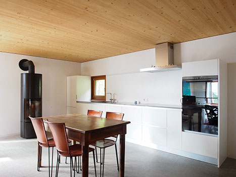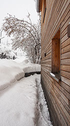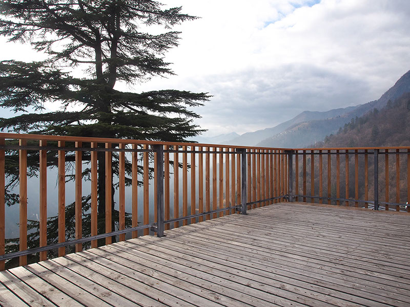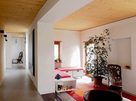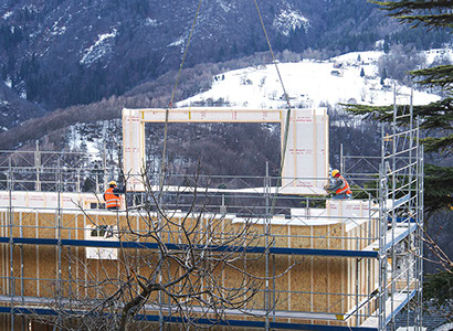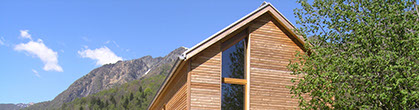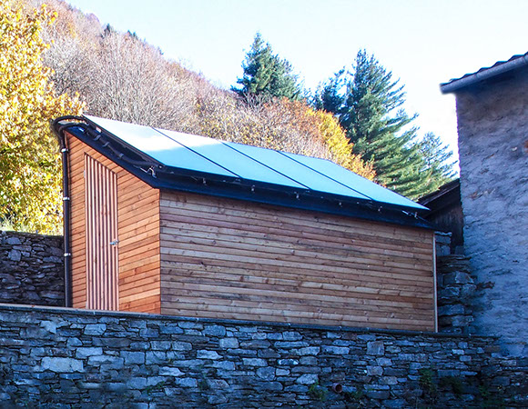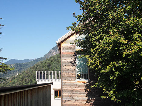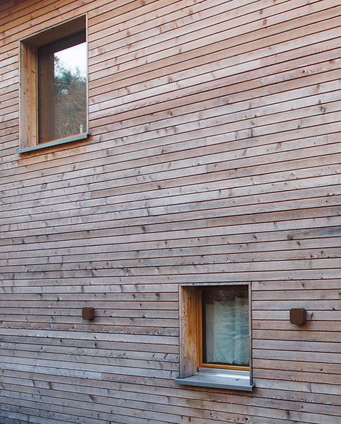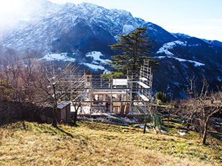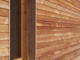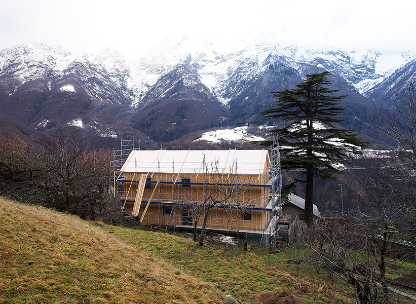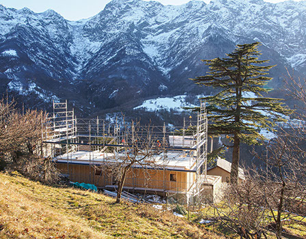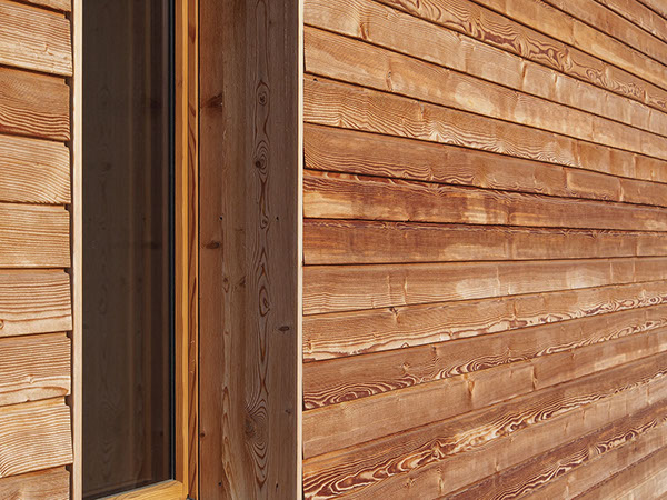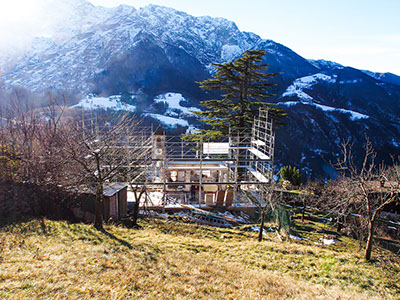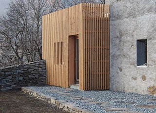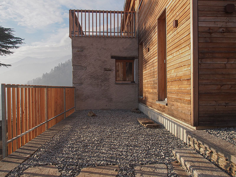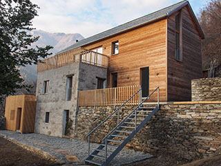 Nuova costruzione prefabbricata in legno. Rivestimento edifico ed esterni in legno di larice, che con il tempo diventa grigio argentato e si armonizza con la pietra dei muri. Il rustico in pietra esistente è stato mantenuto ed integrato nella costruzione.